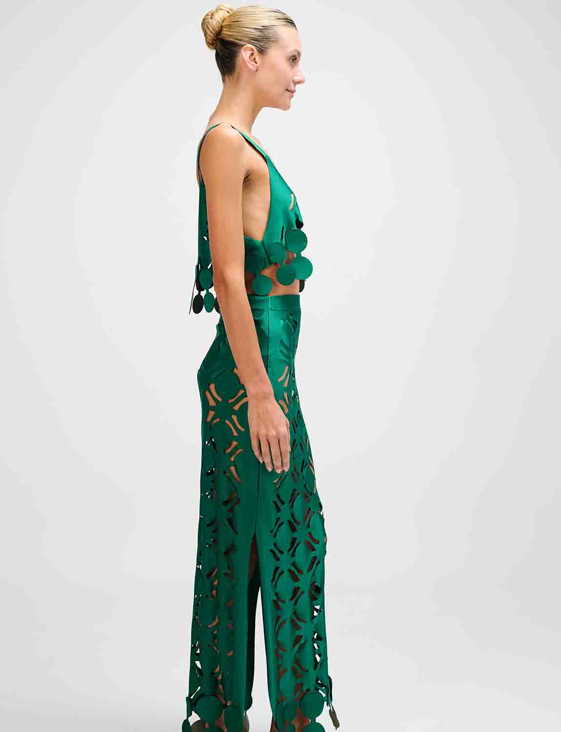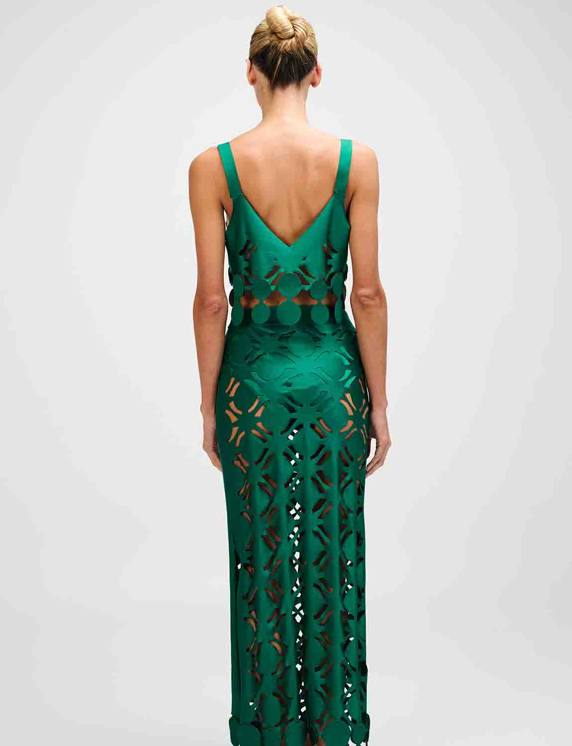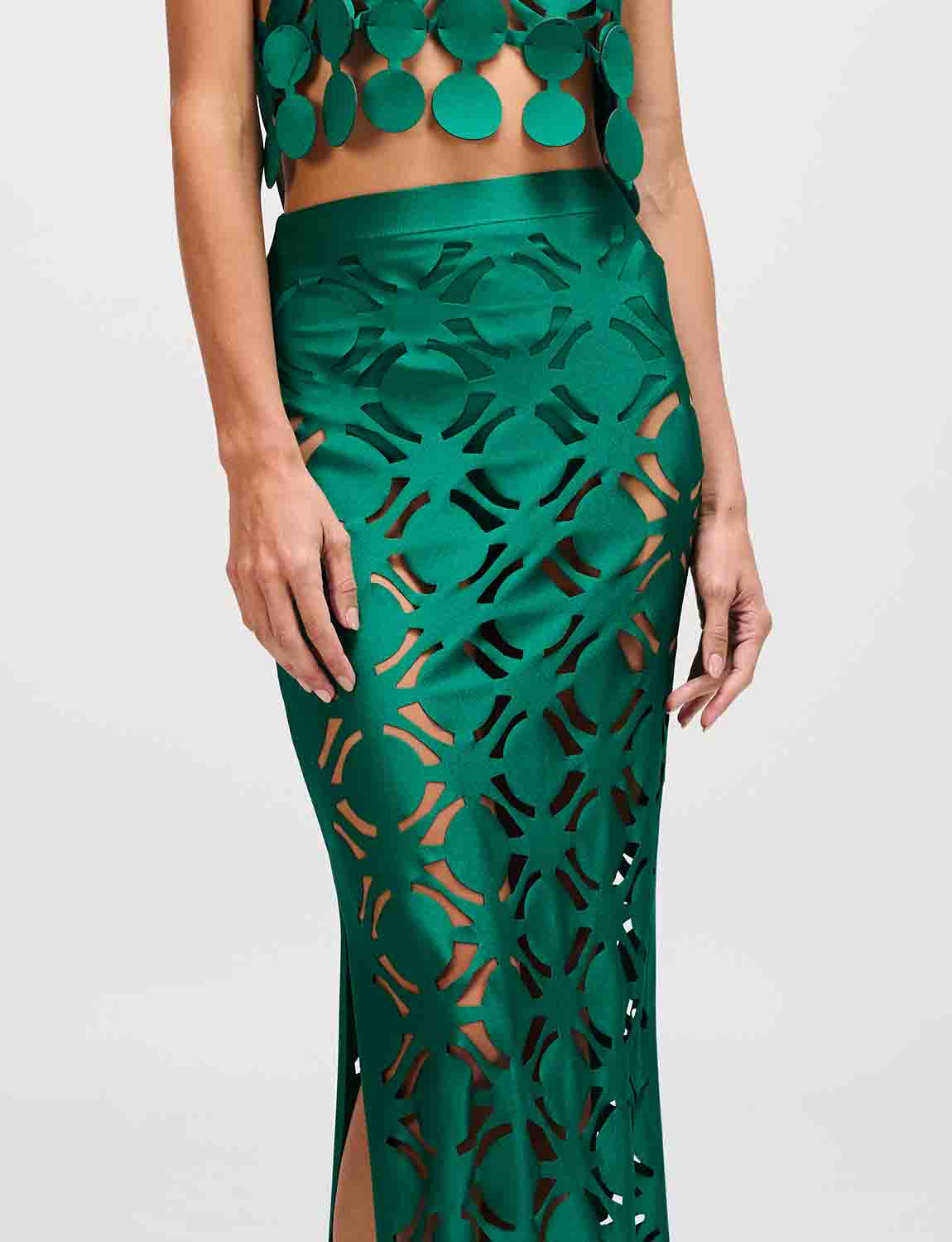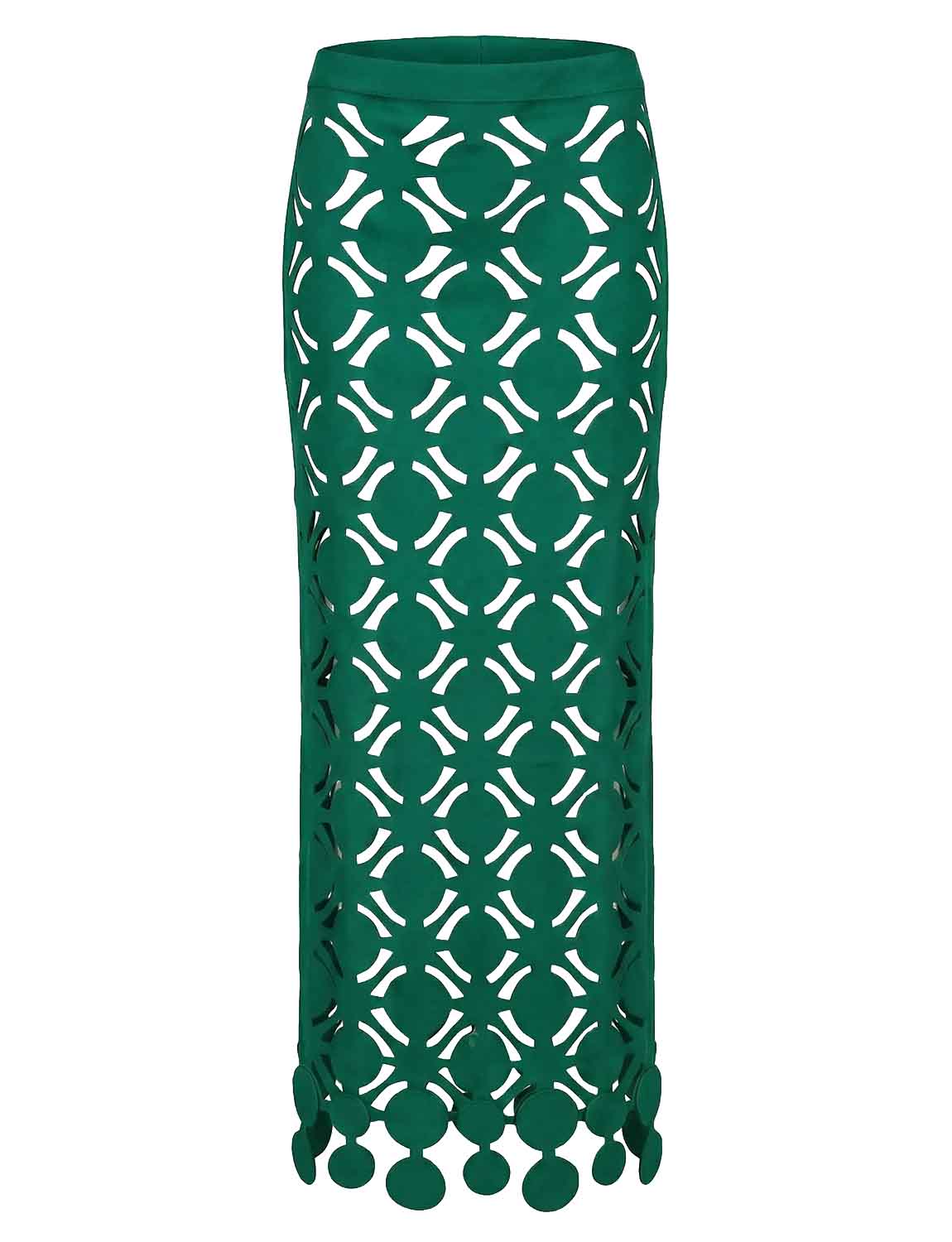 Long skirt with an elastic waistband and side slit. Features laminated wave details, laser-cut and carefully applied one by one.