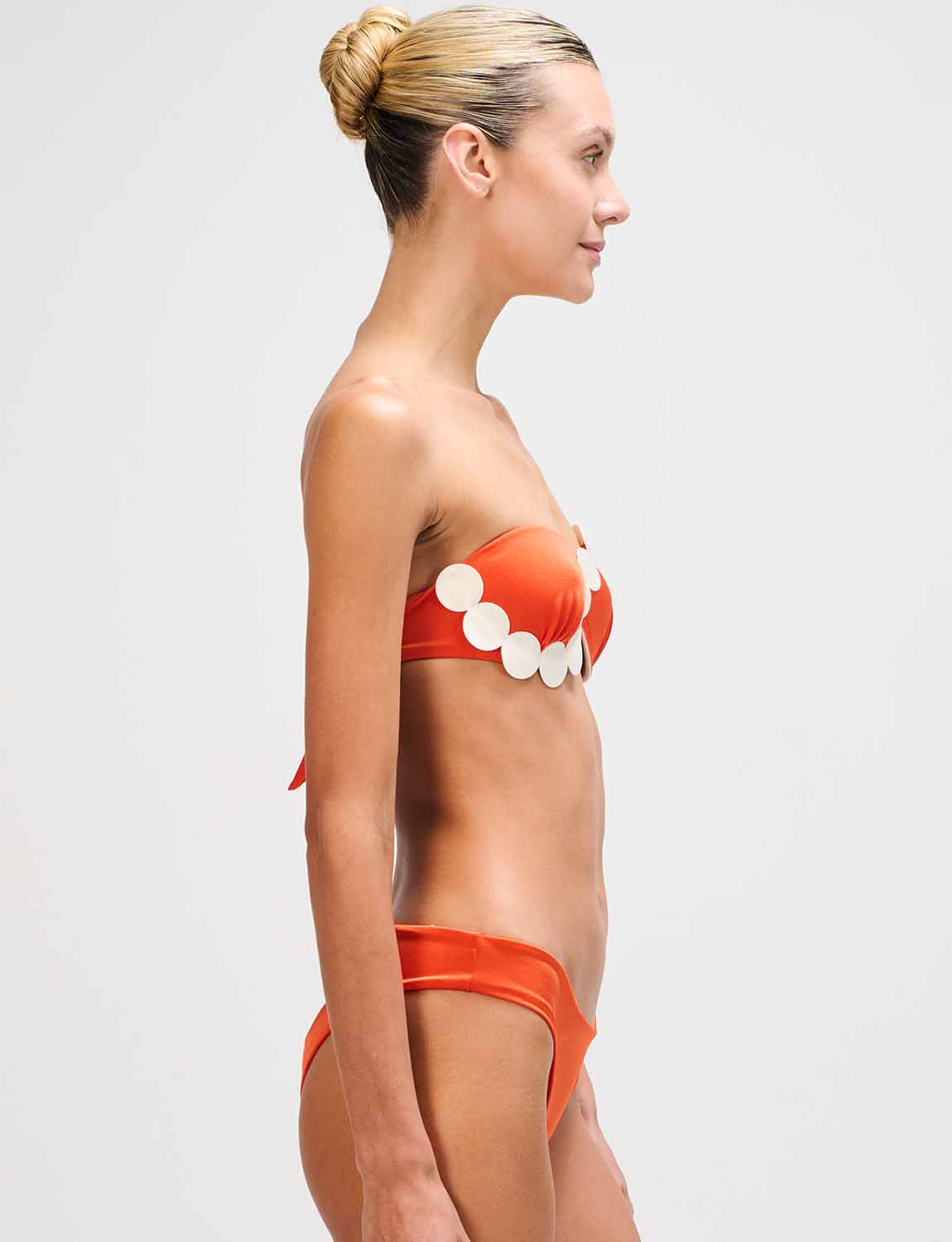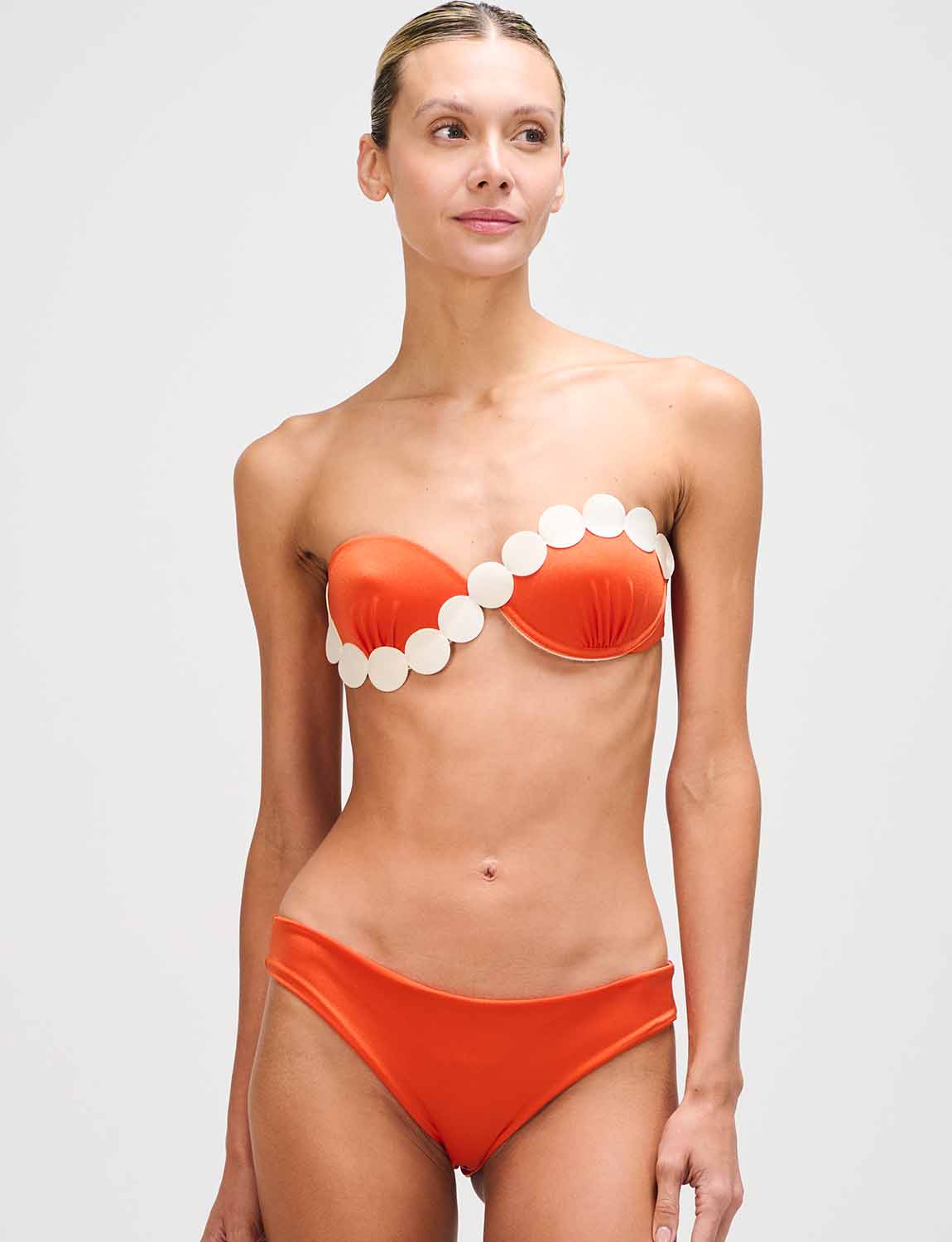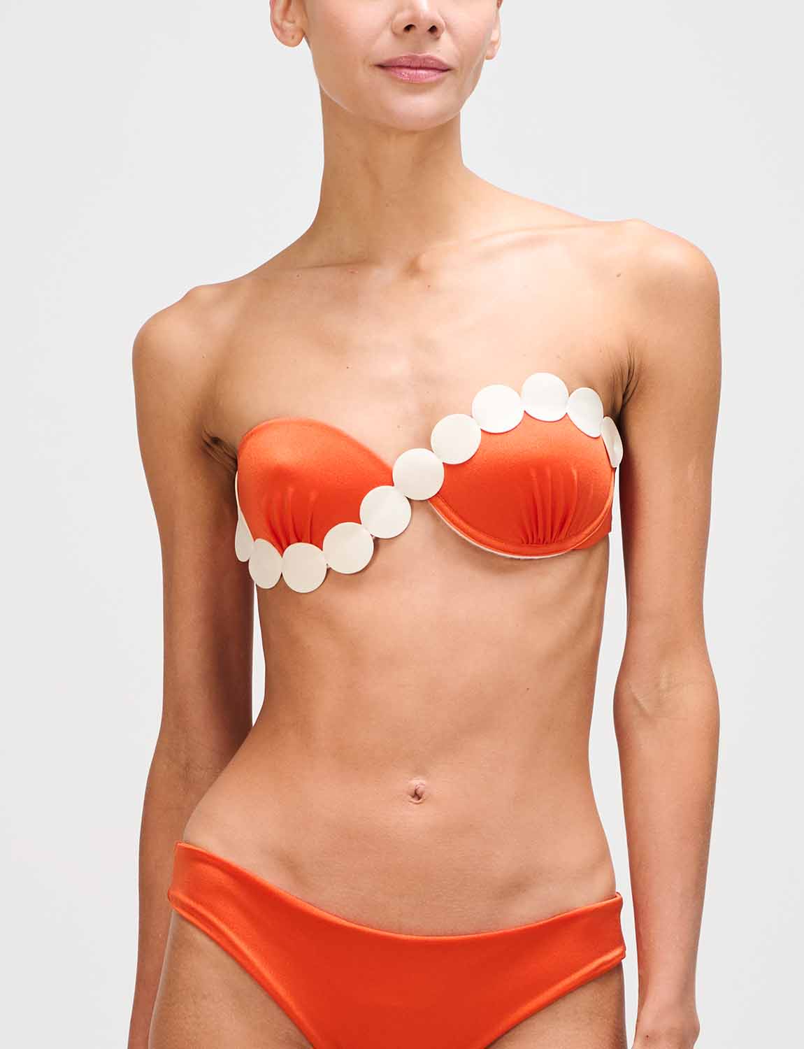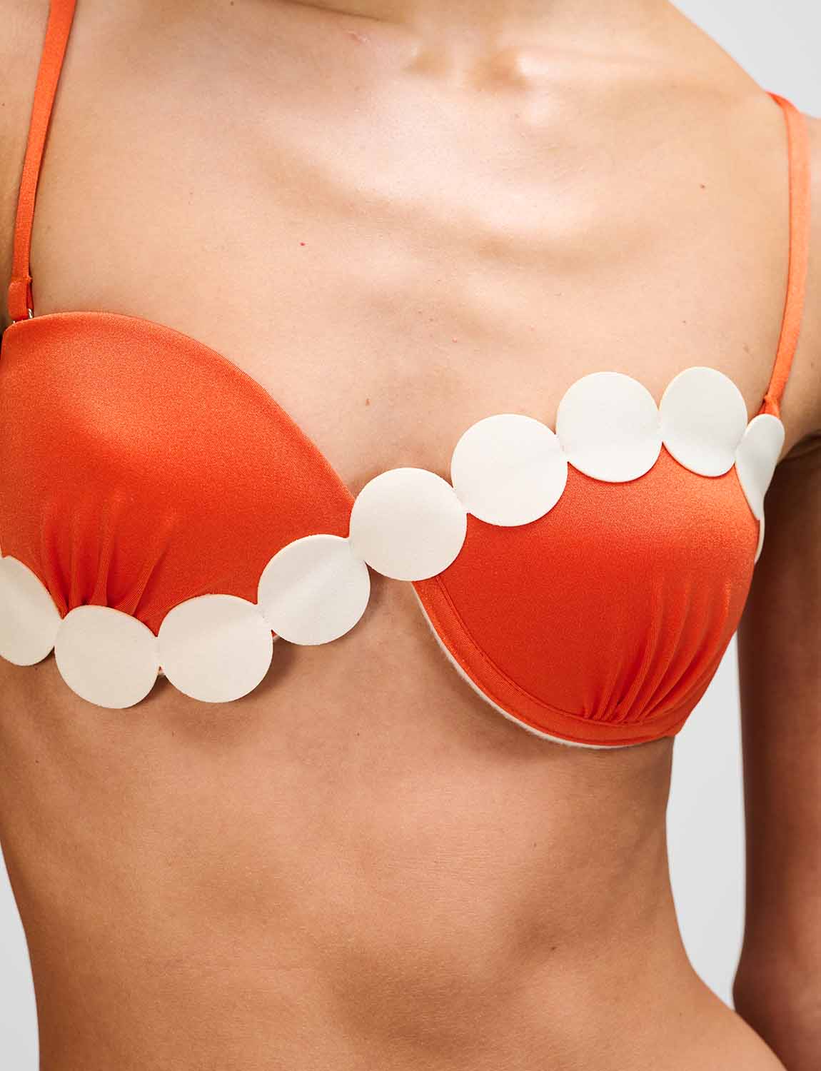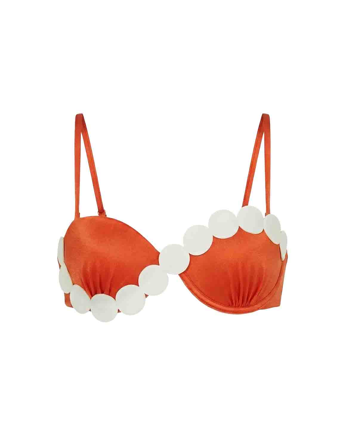Fixed-cup top featuring ANCORA’s iconic silhouette, crafted in satin-finish fabric with laser-cut details applied over the cups. Designed with adjustable and removable straps, and an adjustable back for a personalized fit.