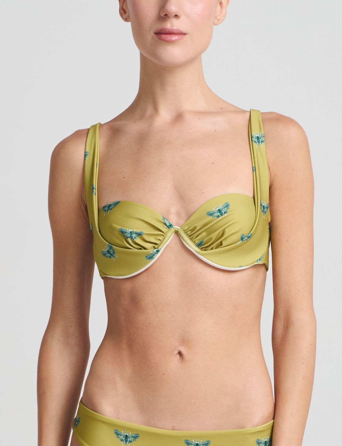 Fixed-cup top with continuous underwire and overlapping strap design on the cups. Adjustable straps with gold-plated tensioners and adjustable back with decorative laminated detail.