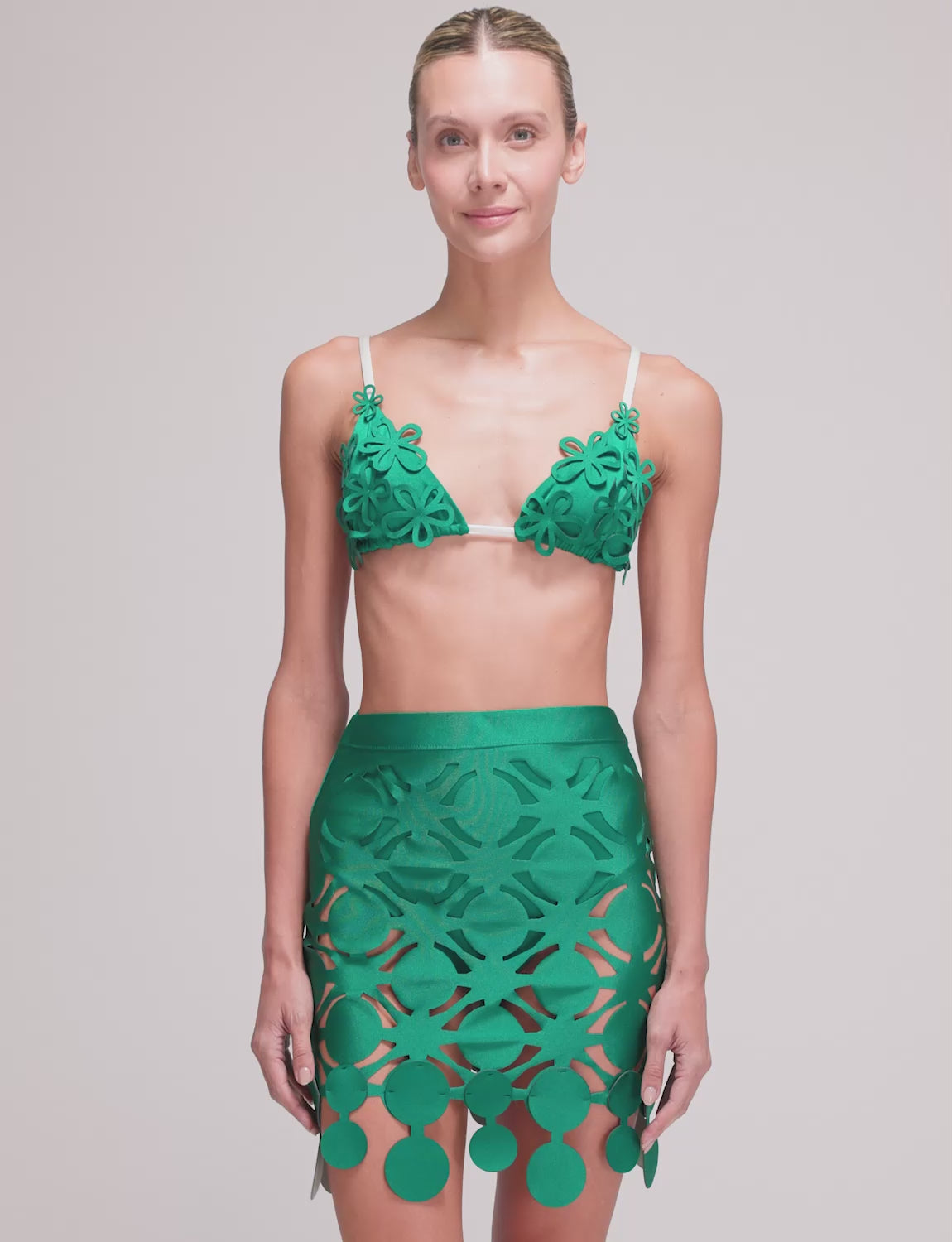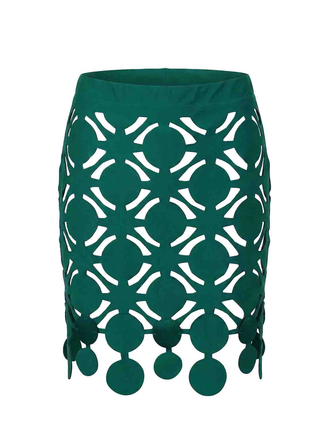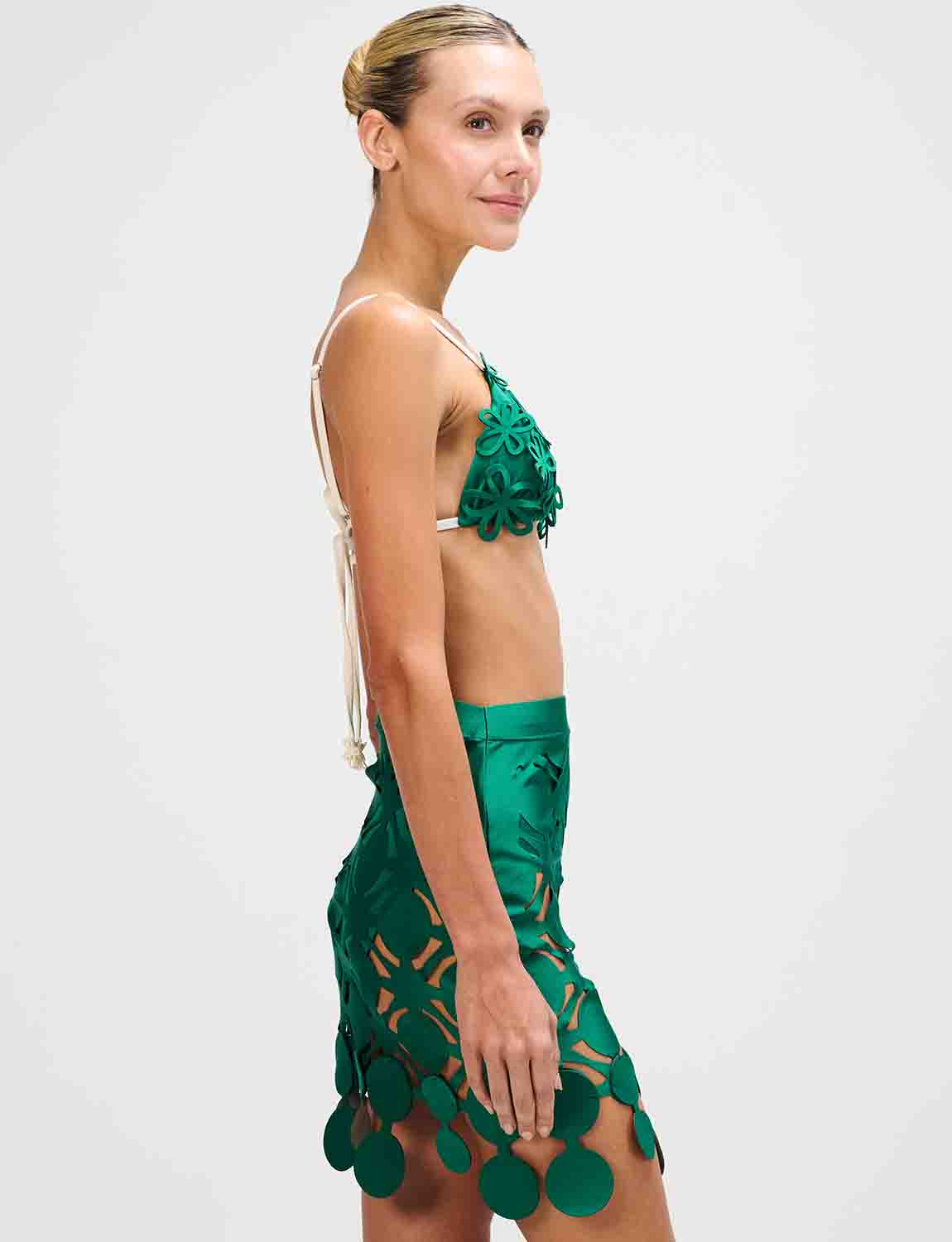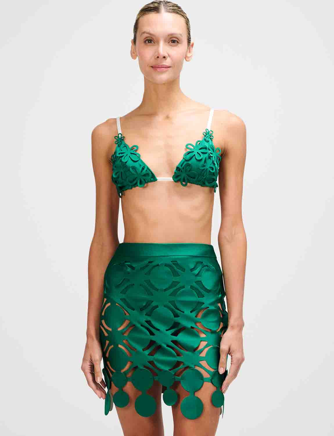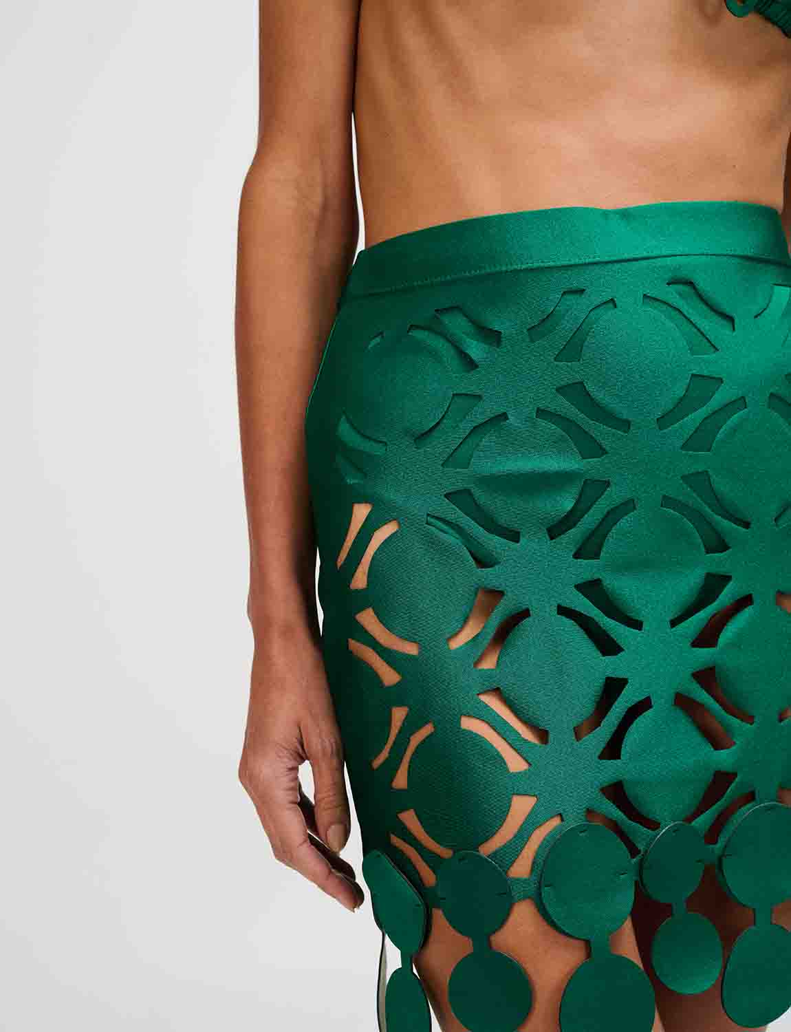 Short skirt with an elastic waistband and laminated wave details, designed using laser-cut techniques and sewn one by one.