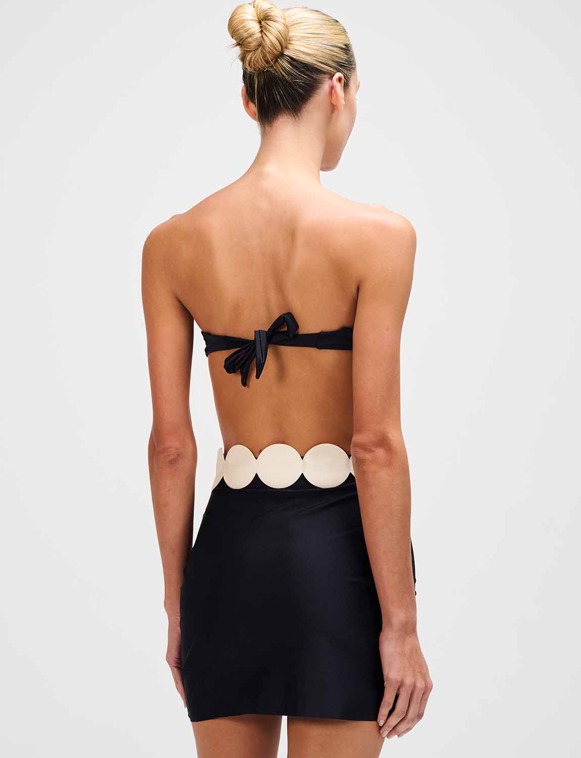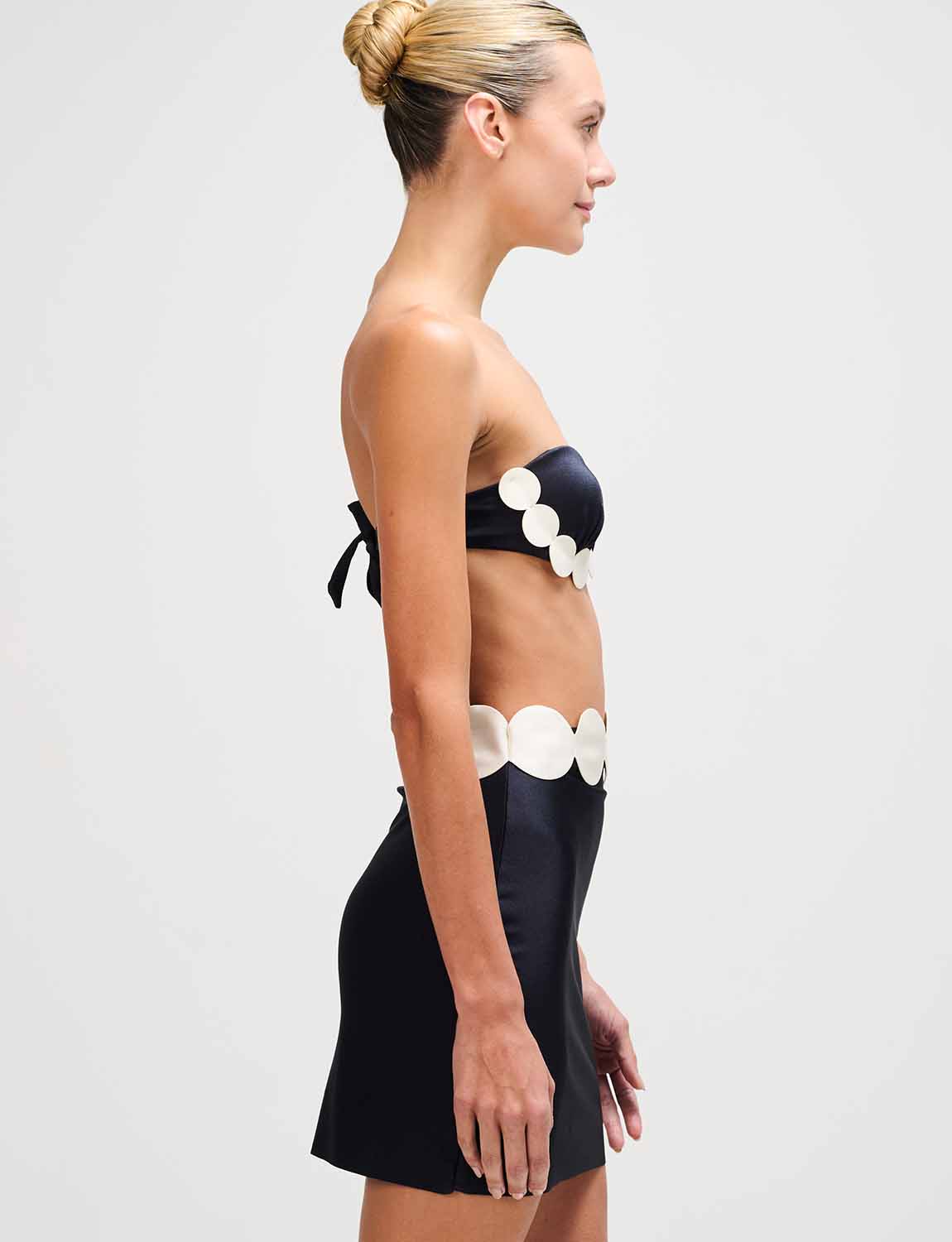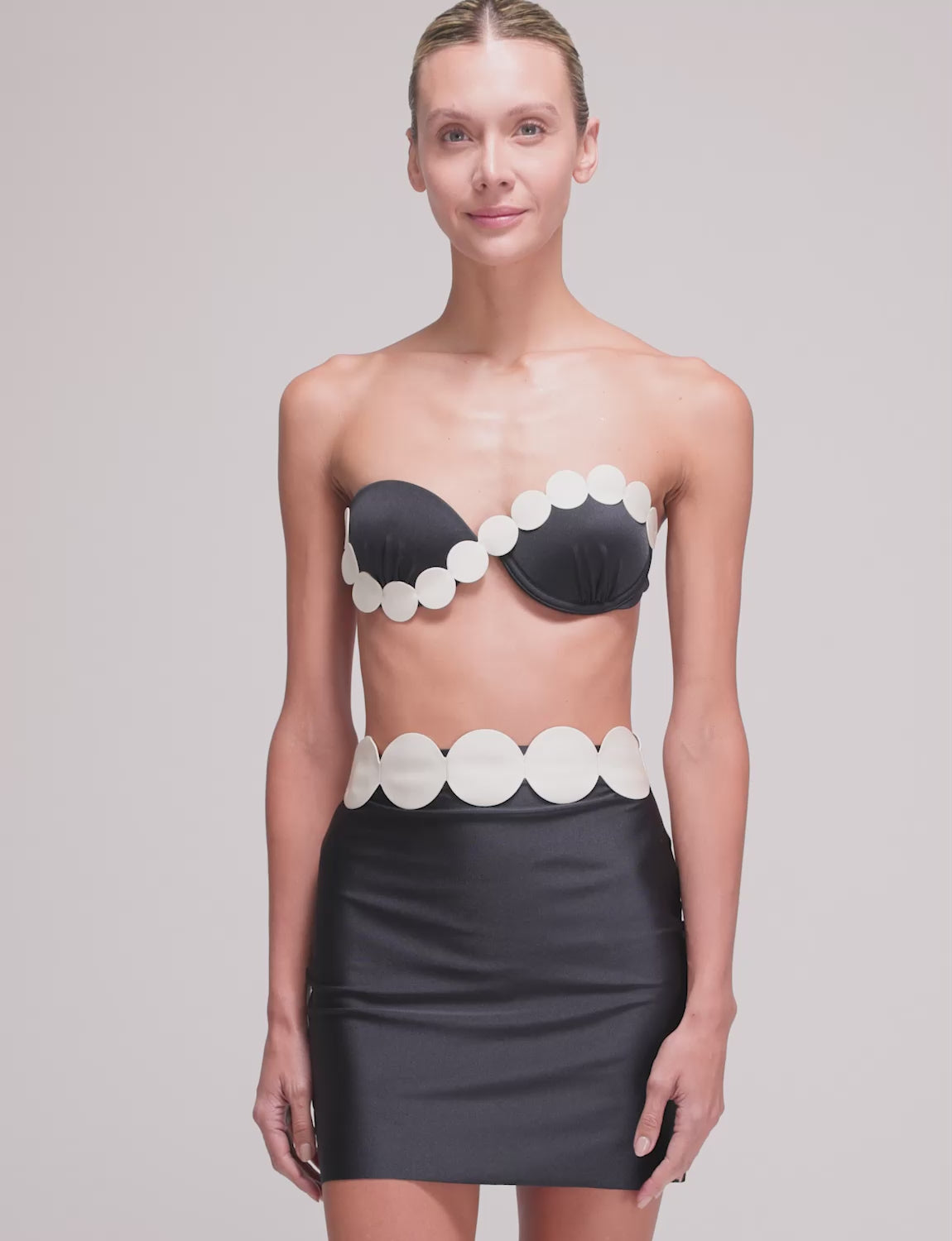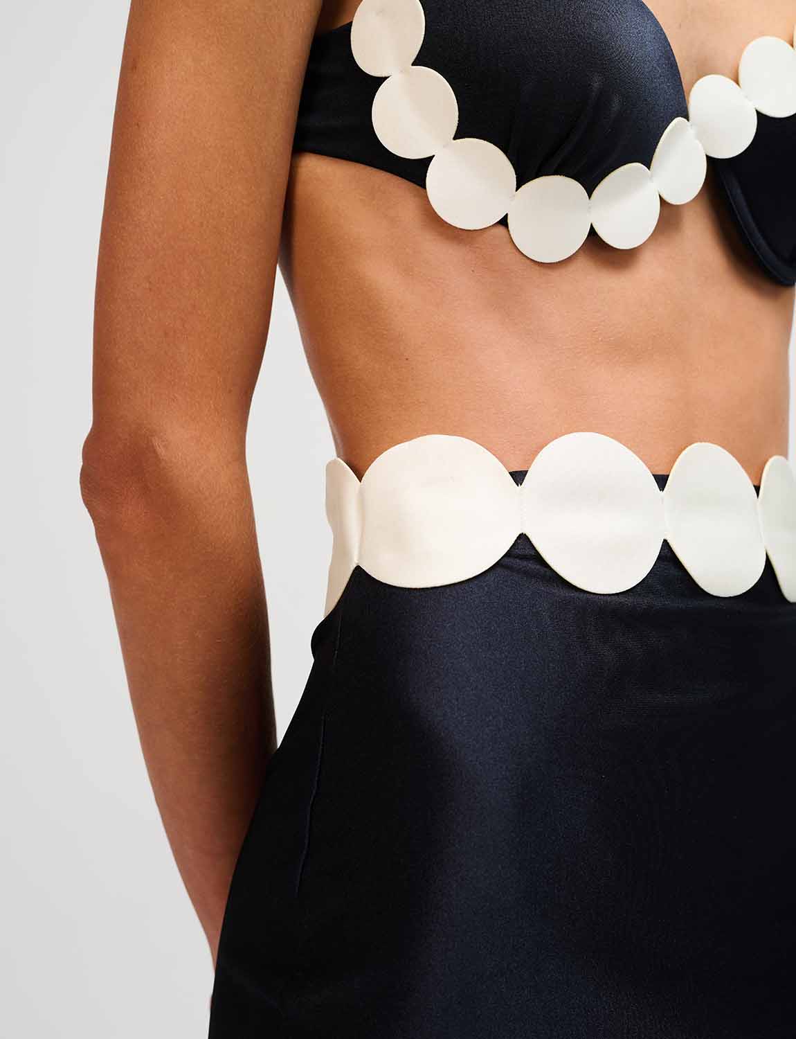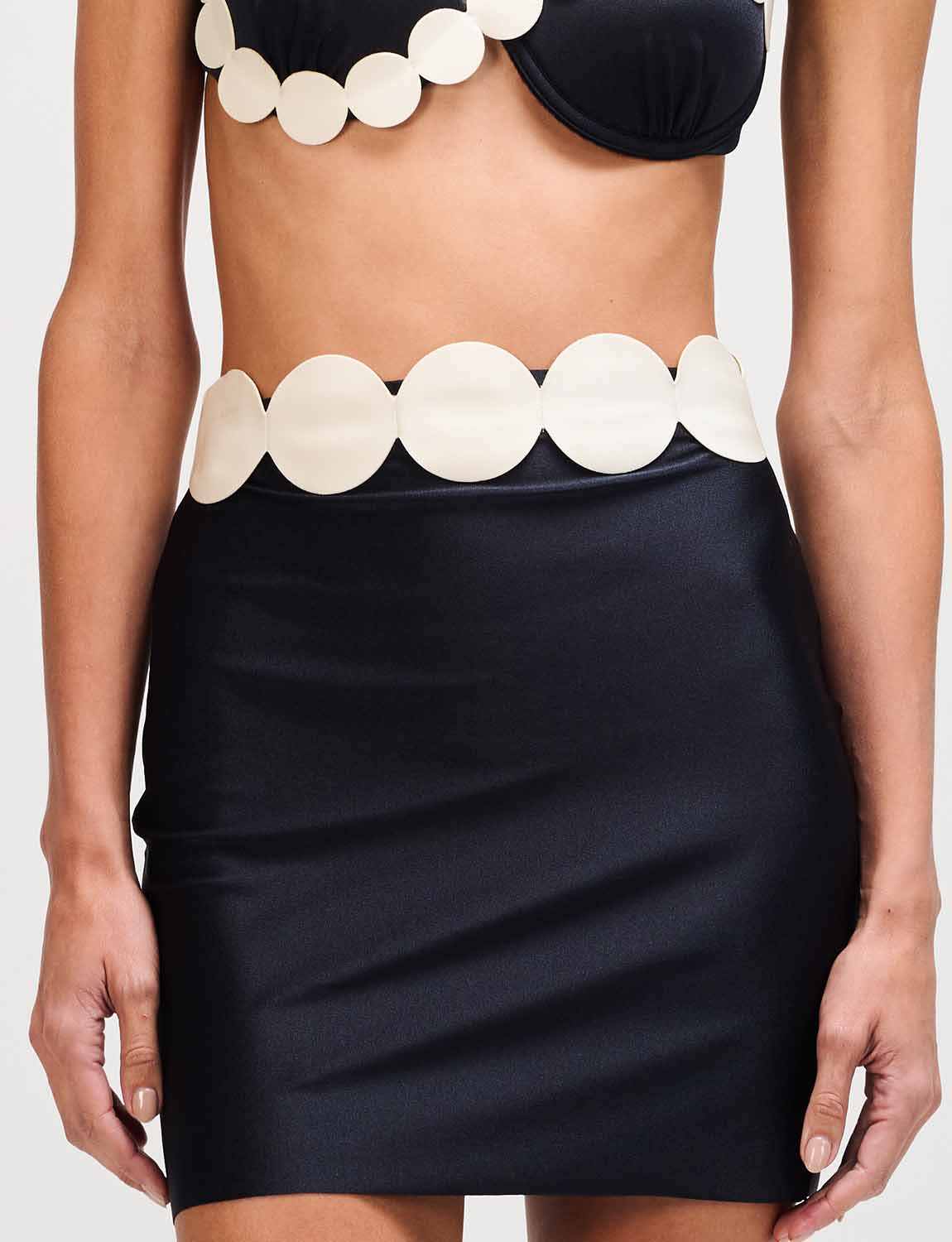 Short skirt with an elastic waistband and laminated wave details, designed using laser-cut techniques and sewn one by one.