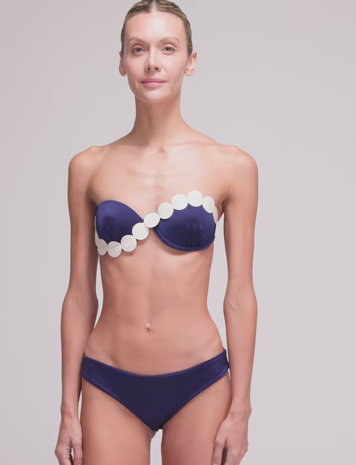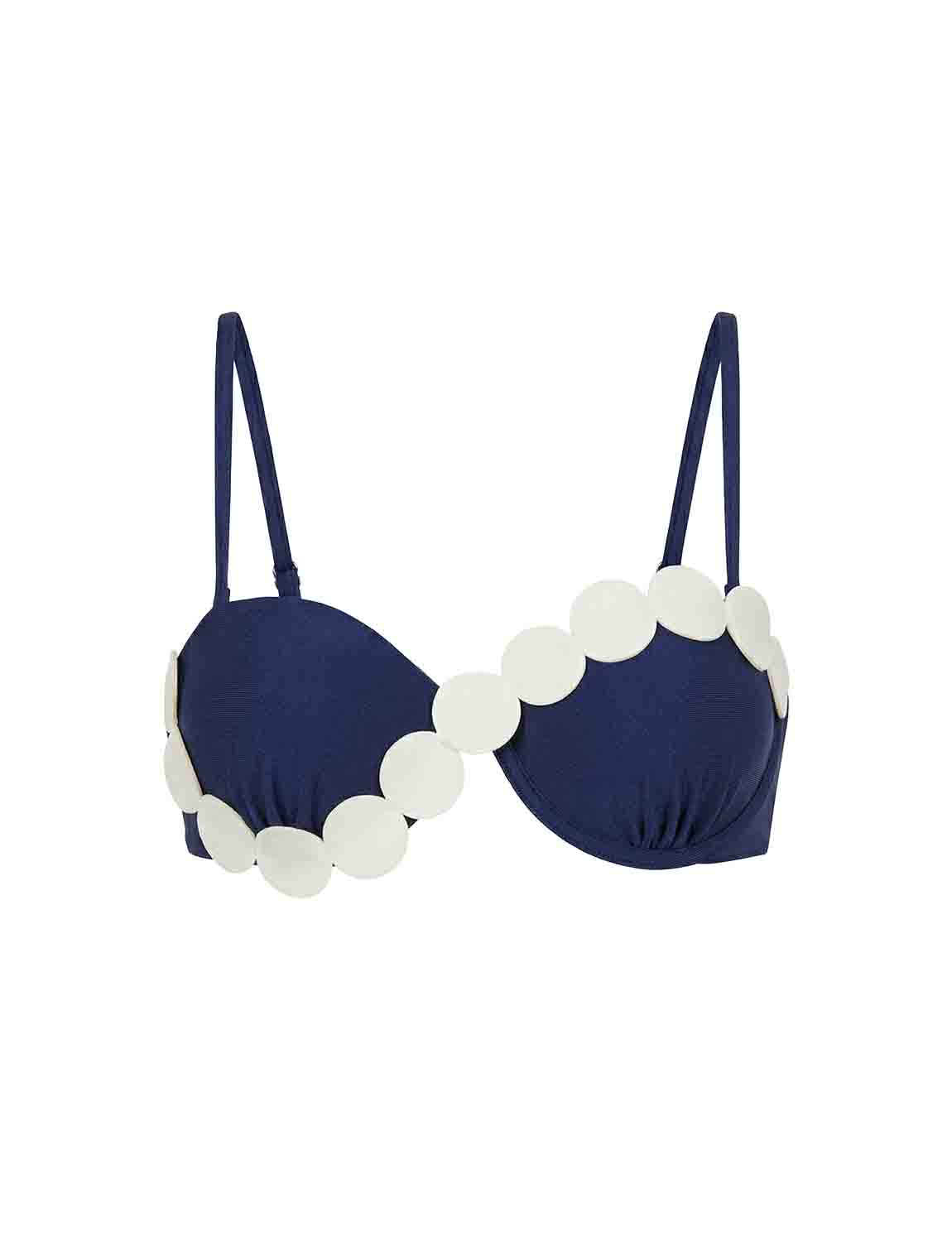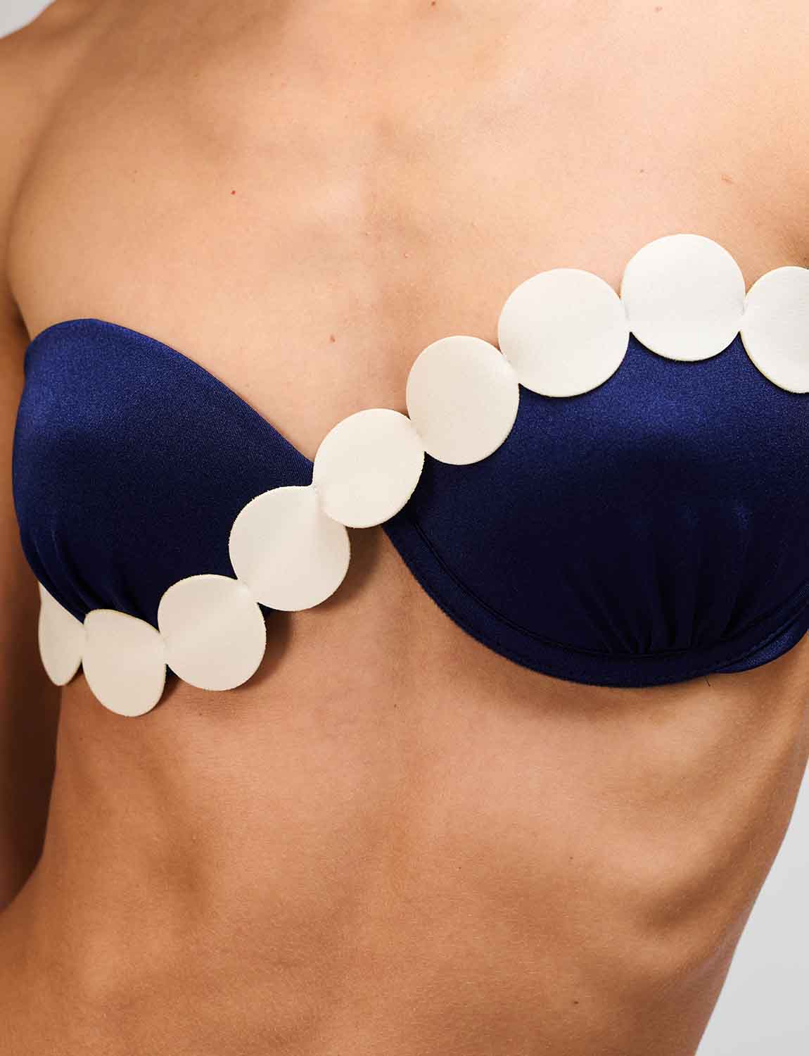 Fixed-cup top featuring ANCORA’s iconic silhouette, crafted in satin-finish fabric with laser-cut details applied over the cups. Designed with adjustable and removable straps, and an adjustable back for a personalized fit.